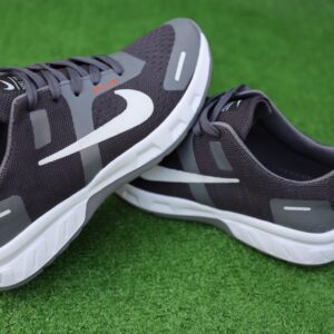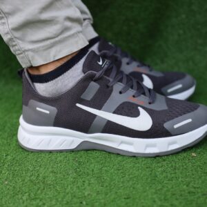 كوتشي رجالي رياضي بخامة Mesh مرنة، باللون الرمادي الغامق مع شعار أبيض ونعل EVA خفيف. مثالي للجري والمشي والنشاط اليومي.