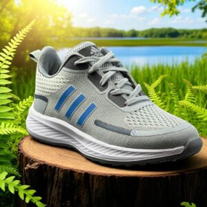 كوتشي رياضي شبابي مقاوم للمياه بلون رمادي جذاب، مع خطوط زرقاء مميزة ونعل EVA مريح، مثالي للجري والمشي والاستخدام اليومي.